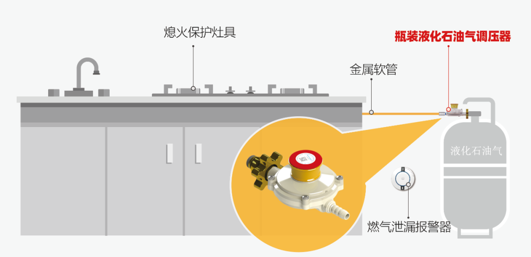 1、應選裝(zhuāng)新型瓶(ping)裝液化(huà)石油氣(qì)安全調(diao)壓器;